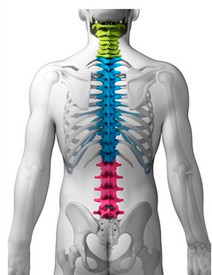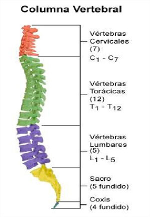 Existen tres regiones en la columna: siete vertebras cervicales (cuello), doce vértebras torácicas (pecho), cinco vértebras lumbares (zona baja de la espalda) , cinco vertebras fusionadas que forman el sacro y cuatro finales que forman el coxis.