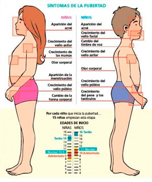 • También se tiene en cuenta la presencia de signos propios de la pubertad. En las niñas se utiliza la aparición de periodos menstruales y el desarrollo de la mama, mientras que en los niños pueden valorarse los cambios en la voz y el vello facial.