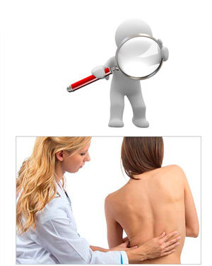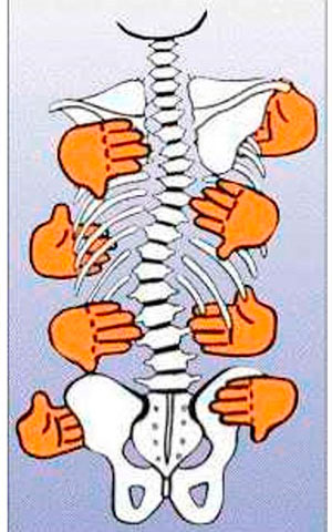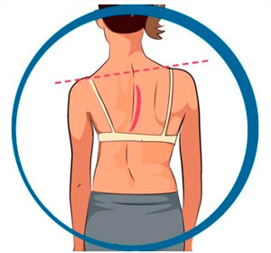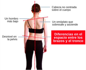 La columna vertebral vista de frente o de espalda debe estar recta. Cuando aparece una escoliosis se aprecia un desplazamiento lateral de la columna hacia la derecha o hacia la izquierda de más de 10º asociada a una rotación vertebral.